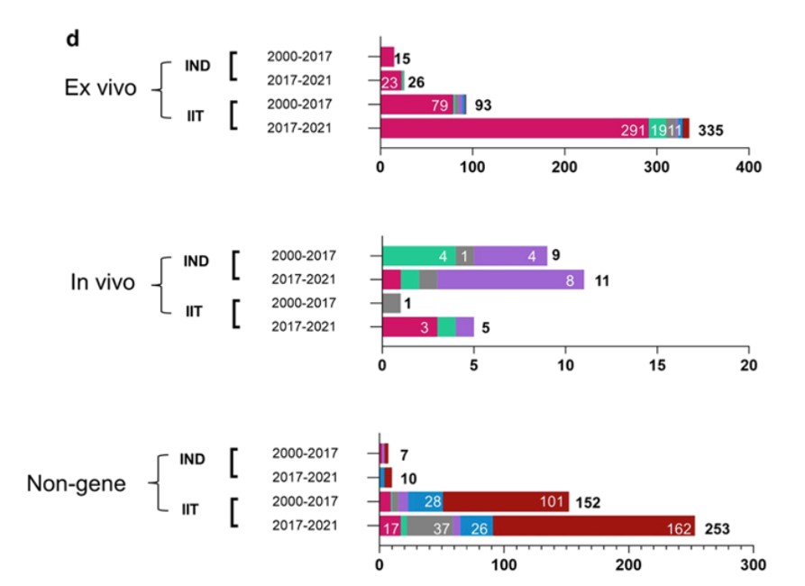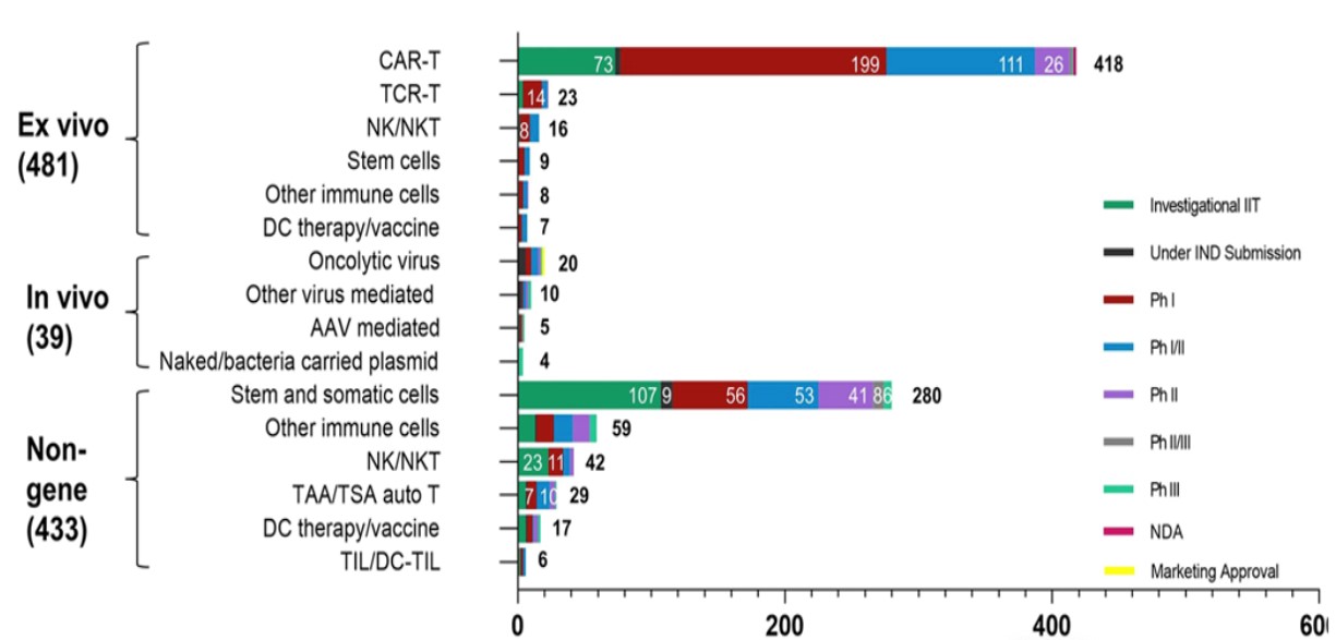 據(jù)公開數(shù)據(jù)顯示,全球CGT大多數(shù)處于早期研發(fā)階段(包括臨床前研究和臨床Ⅰ期),CGT市場處于萌芽期。我國開展的CGT臨床試驗(yàn)數(shù)量目前位居全球第二,臨床開發(fā)熱情高漲。為進(jìn)一步拓展這個領(lǐng)域,國家從十三五到十四五期間出臺了很多政策與CGT相關(guān)的治療原則,旨在加快產(chǎn)業(yè)發(fā)展。