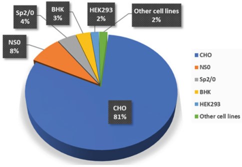 CHO細(xì)胞是最常用的宿主細(xì)胞,從1987 年到2021年2月,通過培養(yǎng)的哺乳動物細(xì)胞生產(chǎn)的獲批生物藥中有 81% 是使用CHO細(xì)胞生產(chǎn)。