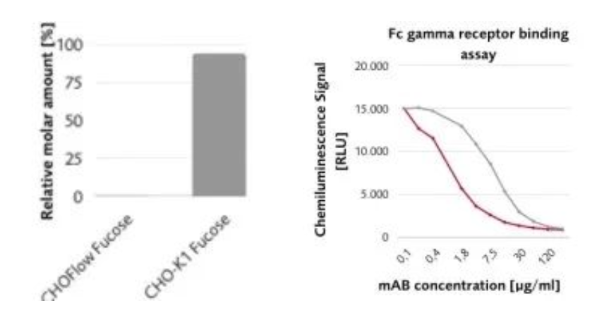 除已有的CHOzen®細(xì)胞系和GLYCOEXPRESS® (GEX®)細(xì)胞系外,漢騰生物新推出的巖藻糖基轉(zhuǎn)移酶8敲除的CHO細(xì)胞系,可賦予重組表達(dá)的單抗無巖藻糖修飾的特性。該細(xì)胞系在產(chǎn)量和生長與野生型CHO K1一致的條件下,無巖藻糖抗體與FcγRs抗原親和力提高,ADCC效應(yīng)加強(qiáng)。