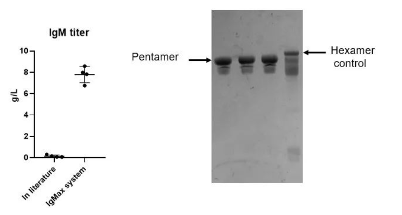 漢騰生物具備高表達(dá)IgM的經(jīng)驗(yàn),經(jīng)過載體系統(tǒng)改進(jìn)及生產(chǎn)工藝的優(yōu)化后可提高lgM表達(dá)量,最高可達(dá)8g/L。其中,IgMaxTM表達(dá)載體平臺(tái)和IgMasterTM工藝平臺(tái)是漢騰生物自主研發(fā)的IgM相關(guān)開發(fā)平臺(tái),其具備了高產(chǎn)量、高純度和高效價(jià)的特點(diǎn),技術(shù)轉(zhuǎn)移路線清晰,可滿足大規(guī)模生產(chǎn)的需求。此外,理化分析、生化分析、制劑開發(fā)和生產(chǎn)能力也均配套完善,可有效解決IgM的產(chǎn)業(yè)化難題。