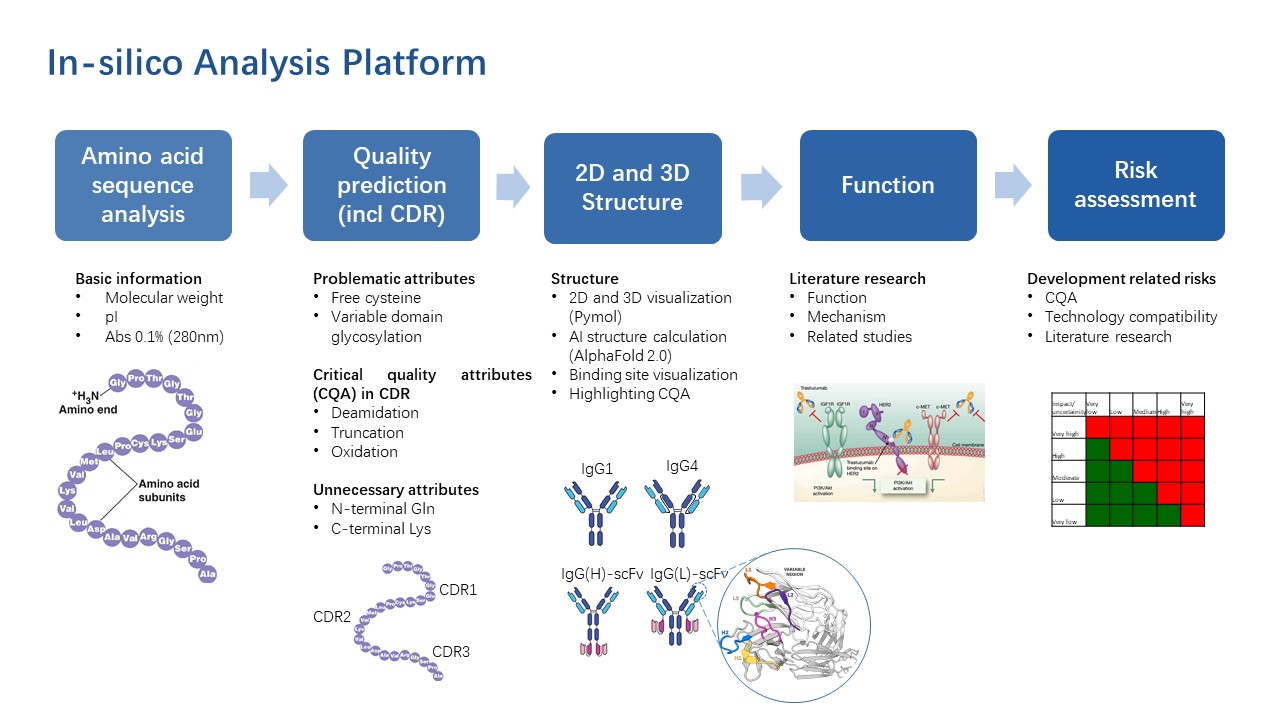 運(yùn)用多種輔助計(jì)算和信息學(xué)工具,基于蛋白序列的in-silico分析,能夠預(yù)測(cè)蛋白的潛在風(fēng)險(xiǎn),如斷裂、聚集、翻譯后修飾等信息,提供可開(kāi)發(fā)性評(píng)估,有助于正確制定藥物開(kāi)發(fā)策略。