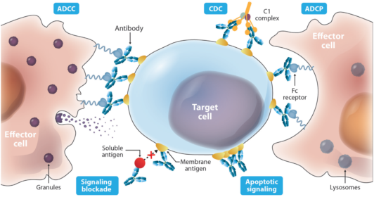 一般IgG類抗體產(chǎn)生作用是通過ADCC (Antibody-Dependent Cell-mediated Cytotoxicity)、ADCP (Antibody-Dependent Cellular Phagocytosis) 和CDC (Complement-Dependent Cytotoxicity) 作用機制,如圖1所示。