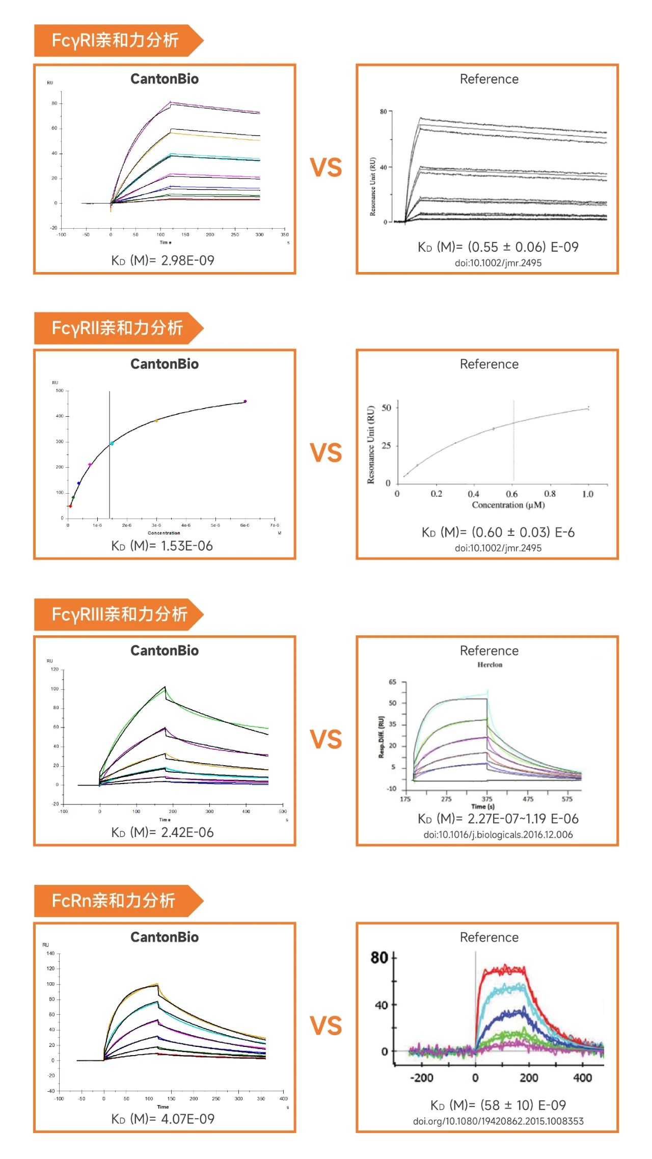 SPR作為經(jīng)典的分子間作用分析方法,收載于美國藥典和中國藥典。漢騰生物能提供高質(zhì)量的SPR檢測分析數(shù)據(jù),滿足IND申報的要求,除FcγR親和力分析外,同時也提供項目特異性的分子與對應受體的親和力分析。